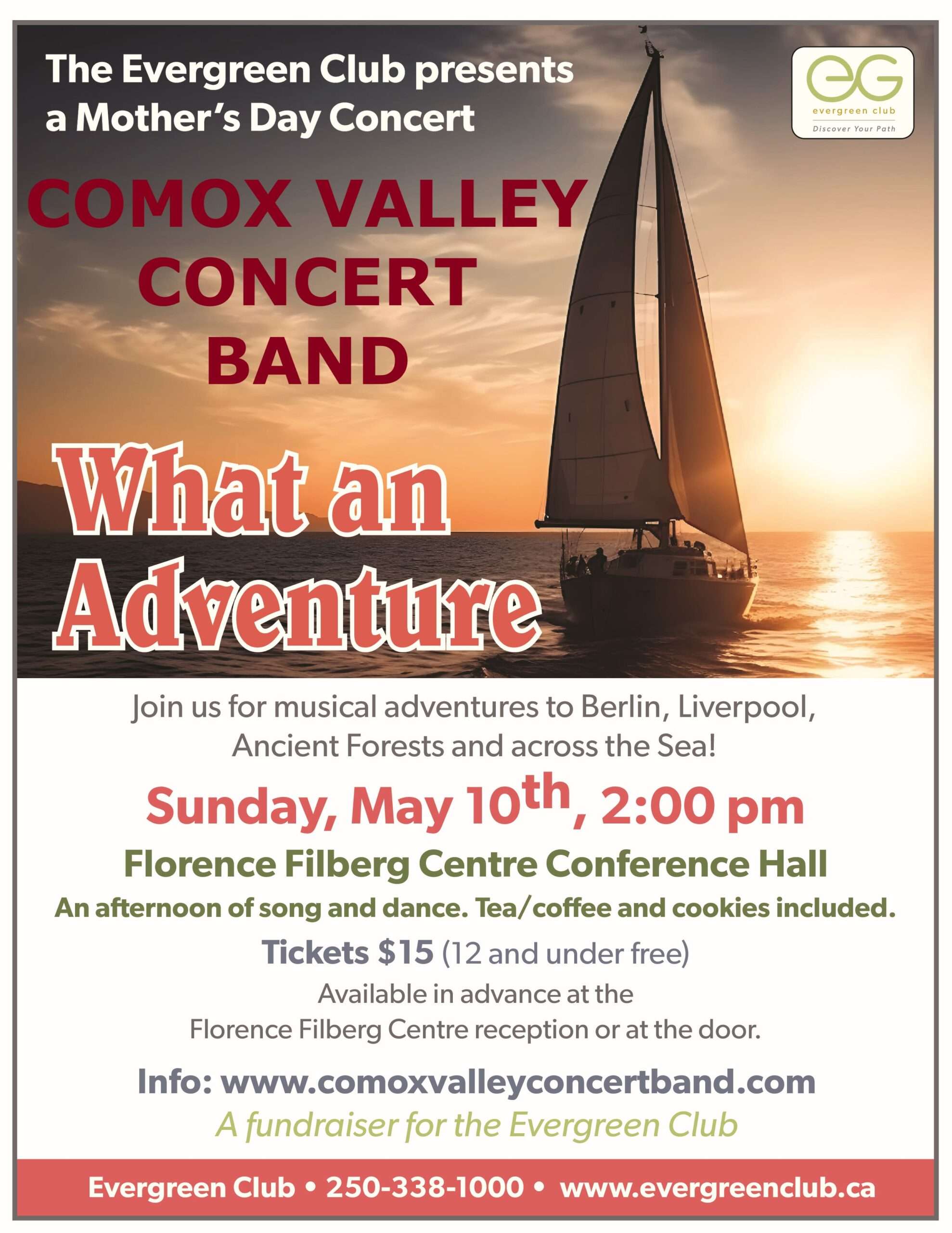 Comox Valley Concert Band presents its annual Mother’s Day concert at the Filberg Centre. Tickets at Evergreen Seniors or at the door.